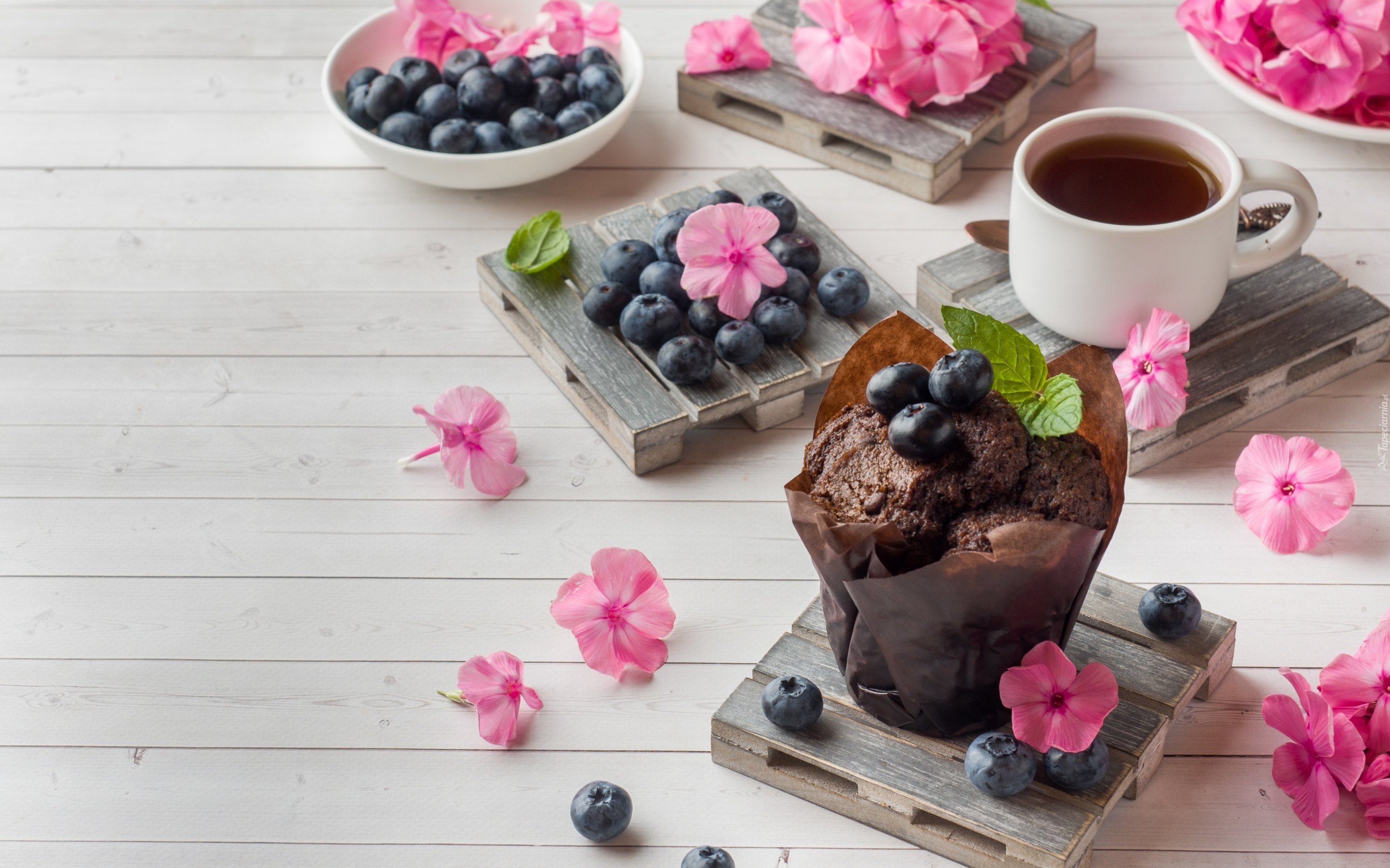 Edytor tapety: Czekoladowa babeczka obok herbaty i borówek