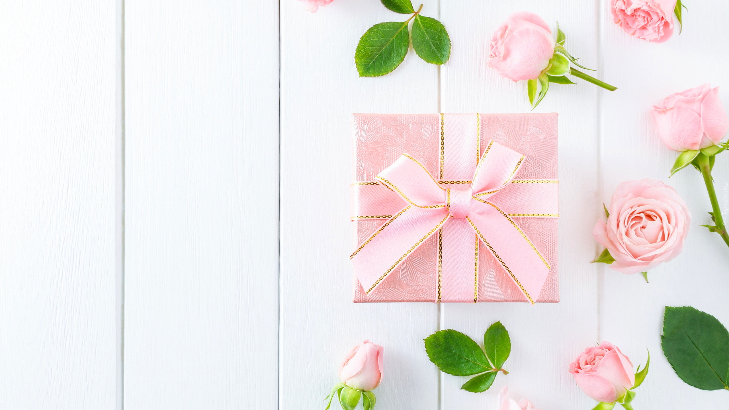 Edytor tapety: Róże ułożone na deskach obok prezentu
