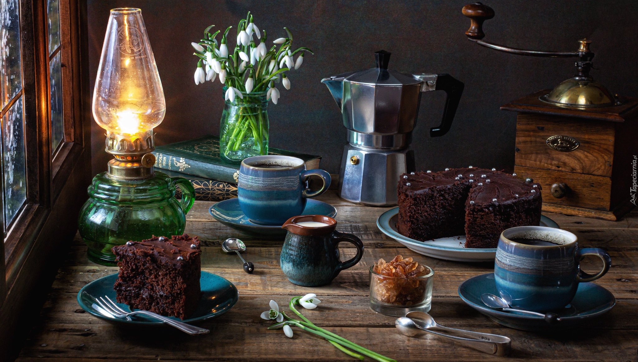Edytor tapety: Czekoladowe ciasto obok lampy naftowej przy oknie