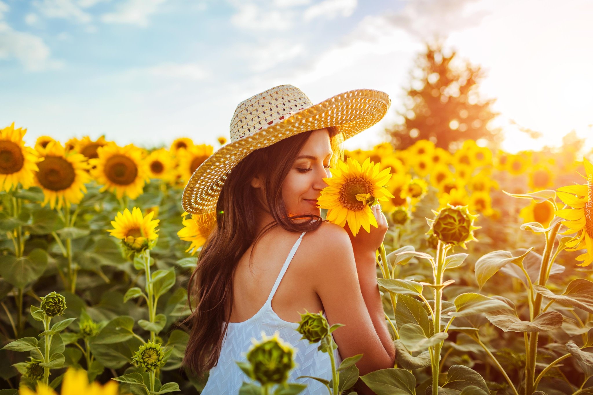Edytor tapety: Kobieta w kapeluszu na polu słoneczników