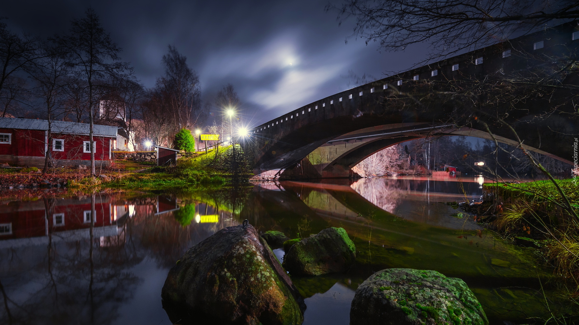 Edytor tapety: Zapalone nocą latarnie przy moście nad rzeką