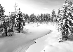 Edytor tapety: Ośnieżona rzeka i świerki
