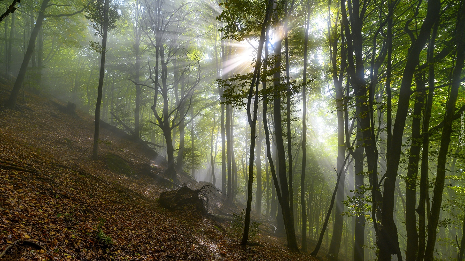 Edytor tapety: Wpadające do zielonego lasu światło słoneczne