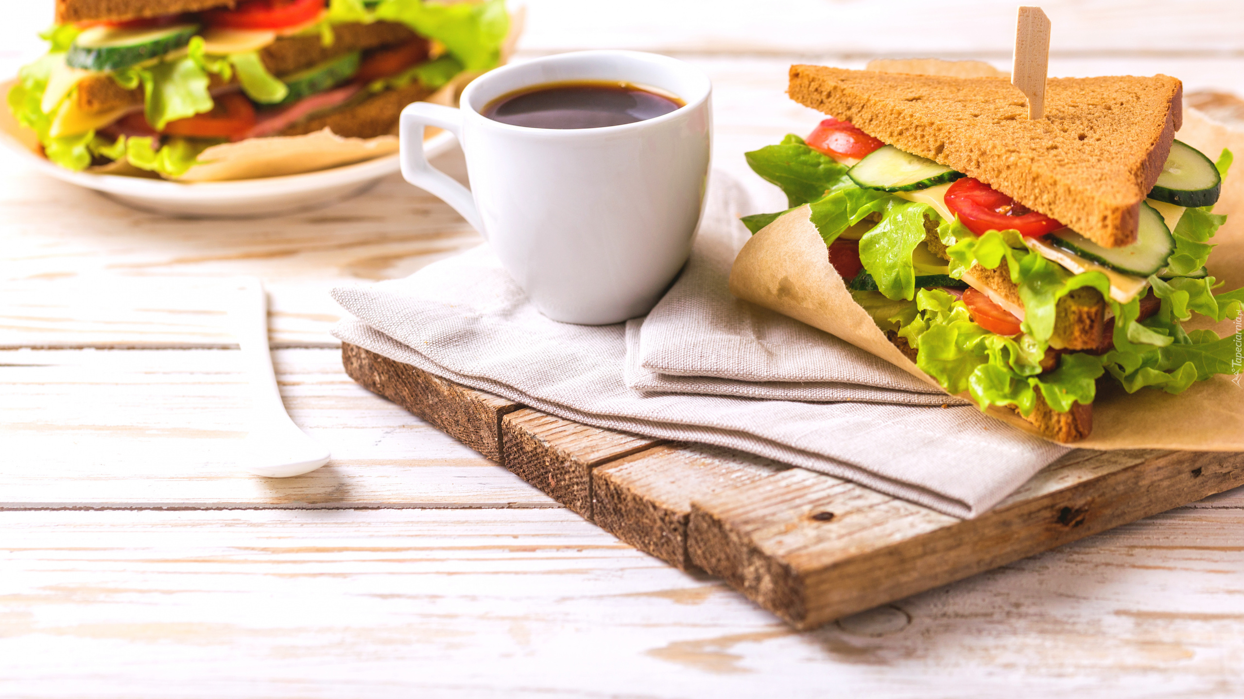 Edytor tapety: Filiżanka kawy obok kanapki z serem i warzywami