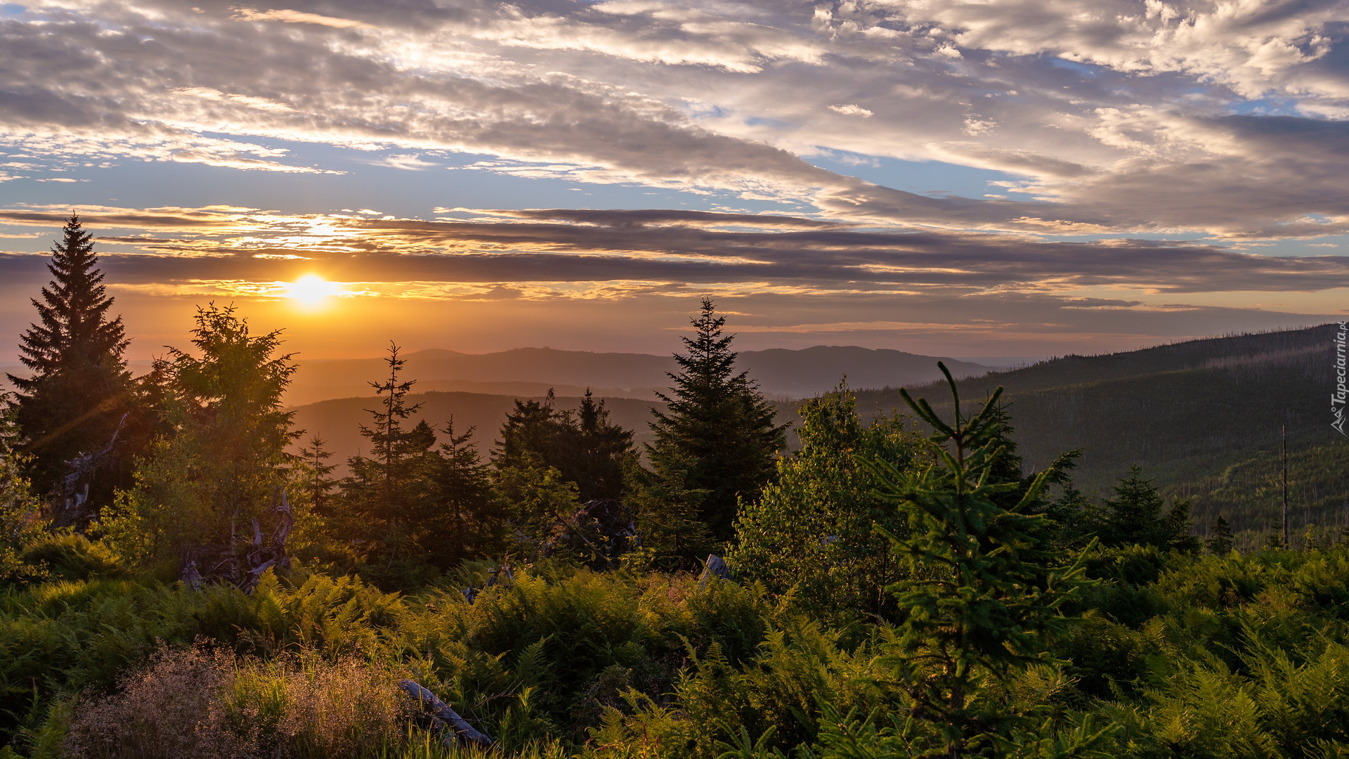Edytor tapety: Drzewa w górach z widokiem na wschód słońca