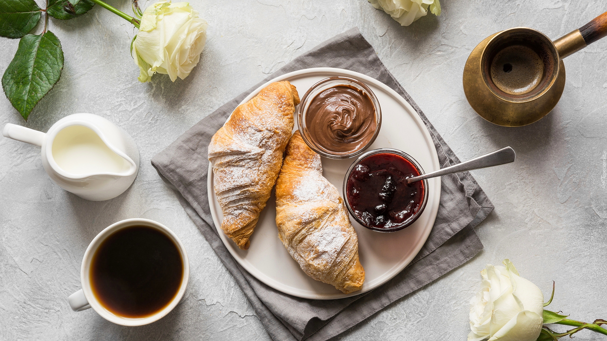 Edytor tapety: Filiżanka kawy obok talerza z rogalikami i dżemem