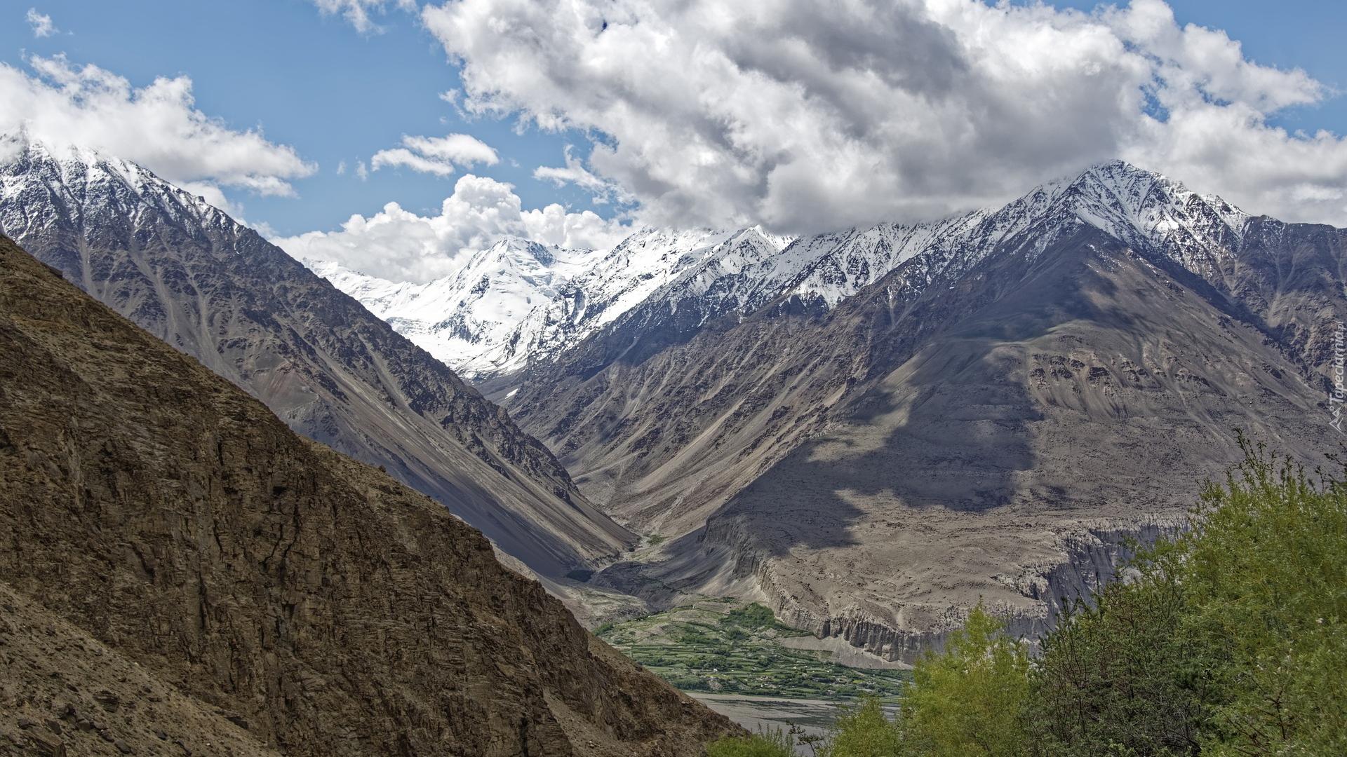 Edytor tapety: Ośnieżone szczyty gór nad doliną