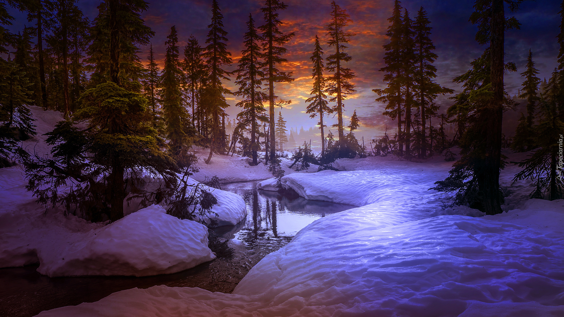 Edytor tapety: Drzewa na tle kolorowych chmur nad leśną rzeką