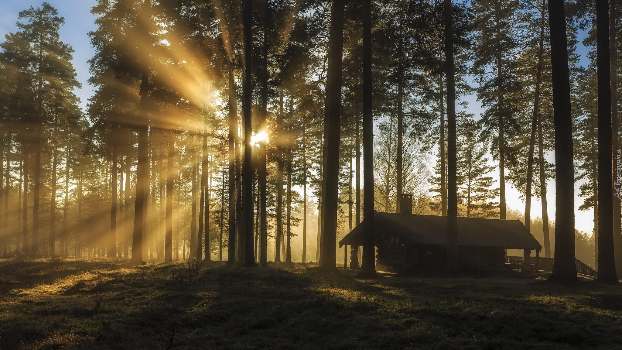 Edytor tapety: Domek wśród rozświetlonych słońcem drzew