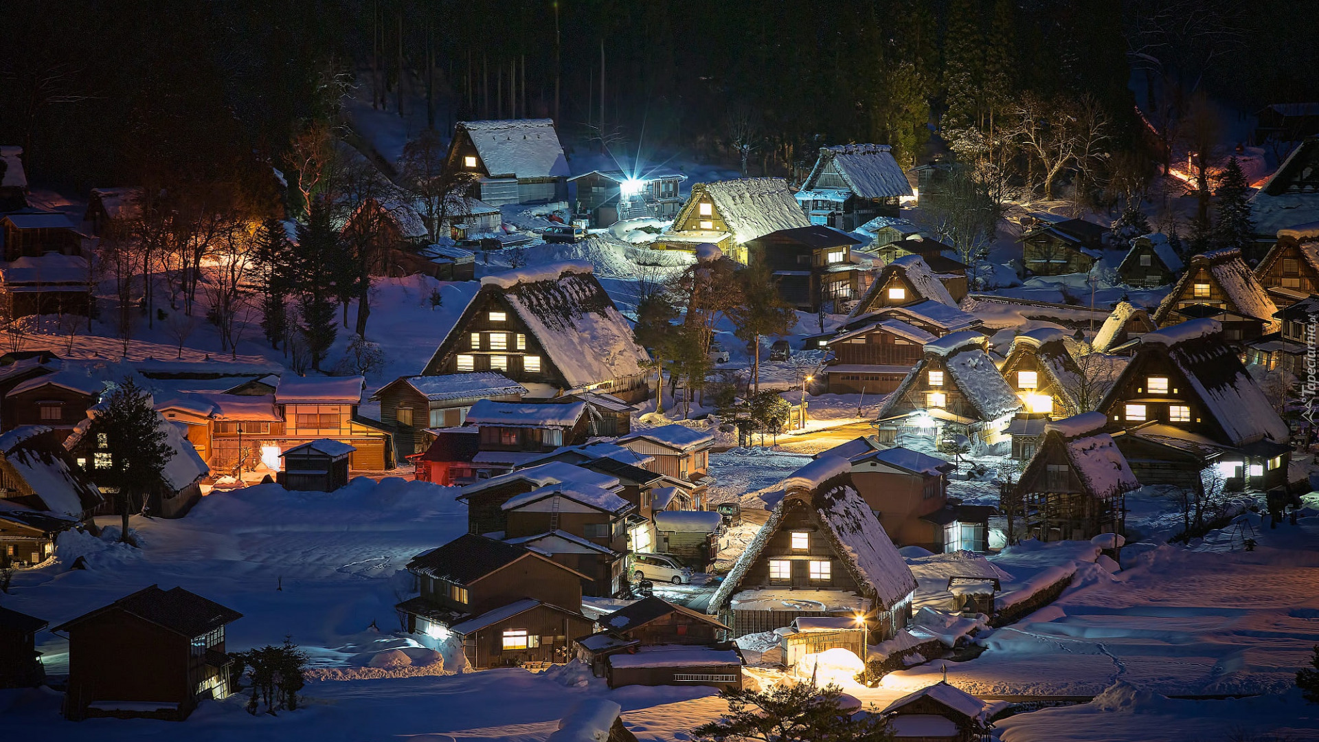 Edytor tapety: Wieś Shirakawa na wyspie Honsiu nocą