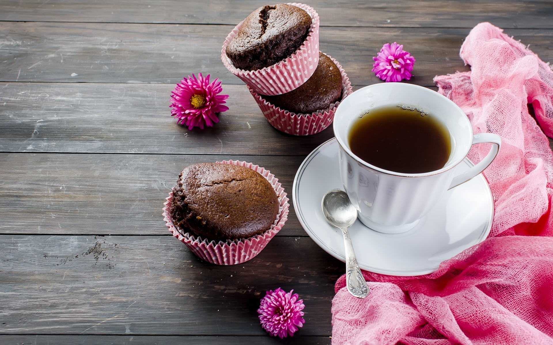 Edytor tapety: Czekoladowe babeczki obok filiżanki herbaty