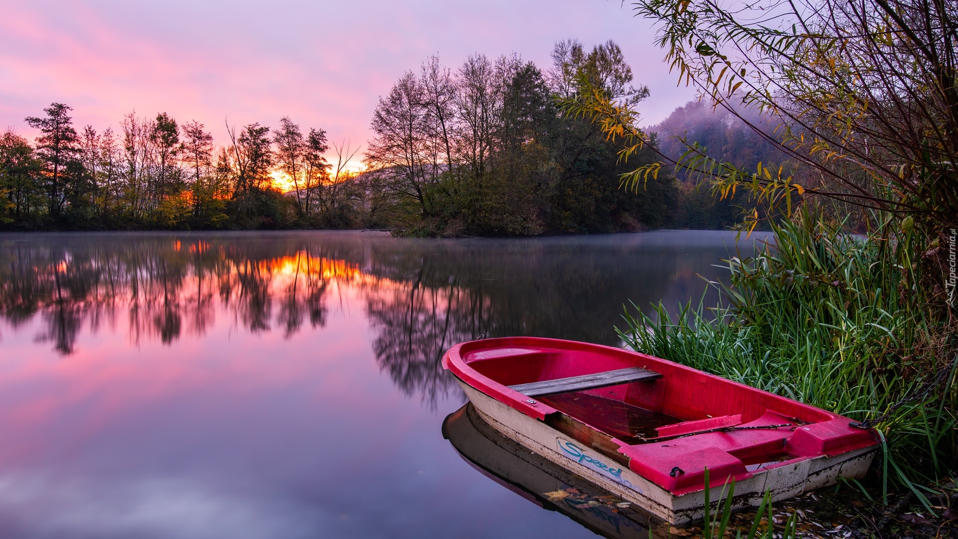 Edytor tapety: Czerwona łódka w zaroślach