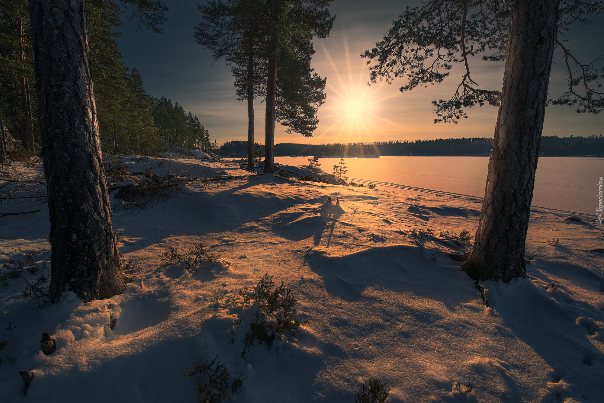 Edytor tapety: Widok zza drzew na ośnieżone jezioro w Ringerike