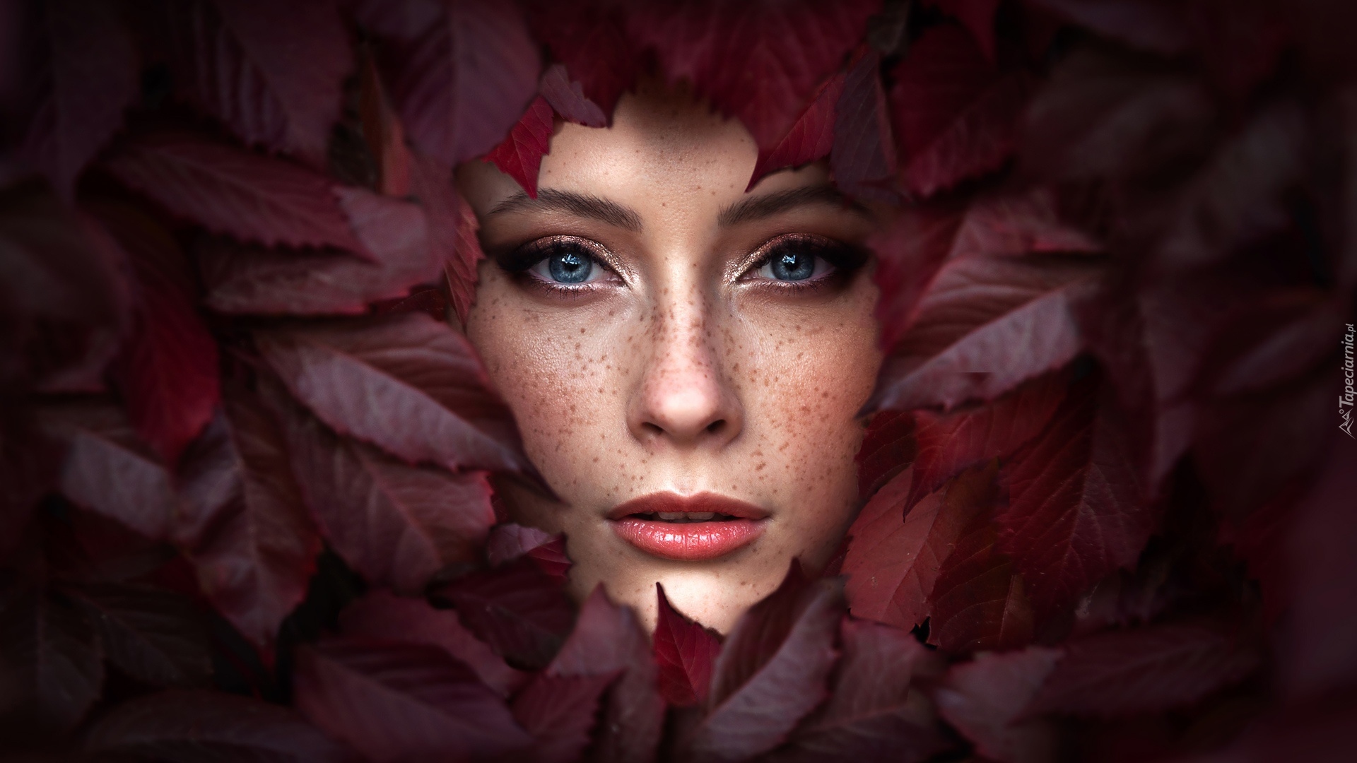 Edytor tapety: Twarz piegowatej kobiety wśród liści