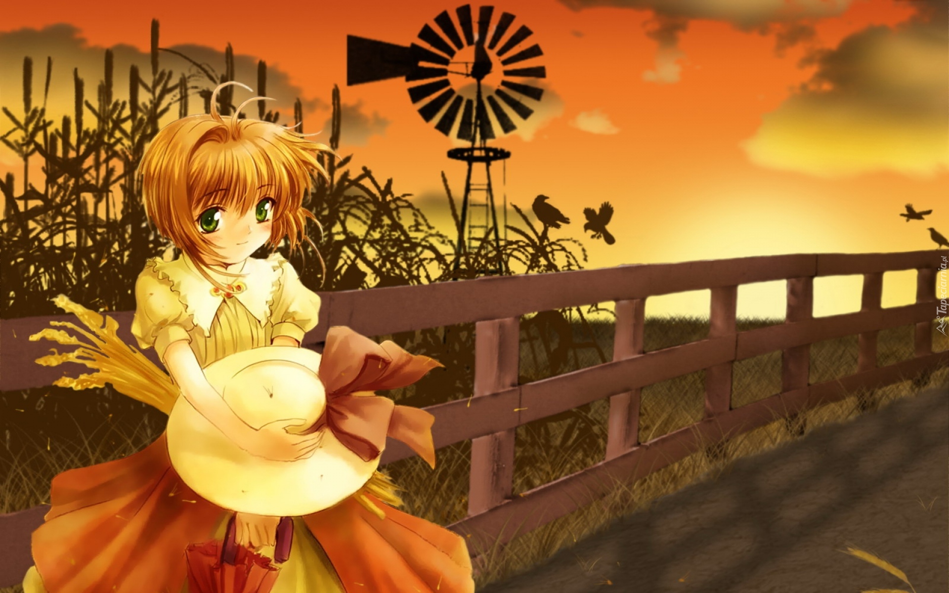 Edytor tapety: Cardcaptor Sakura, wiatrak, dziewczyna, kapelusz, płot