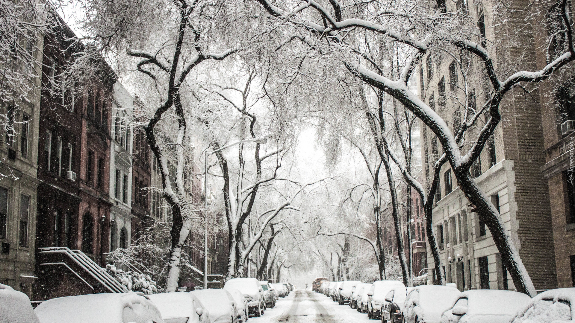 Edytor tapety: Ośnieżone drzewa i samochody na miejskiej ulicy