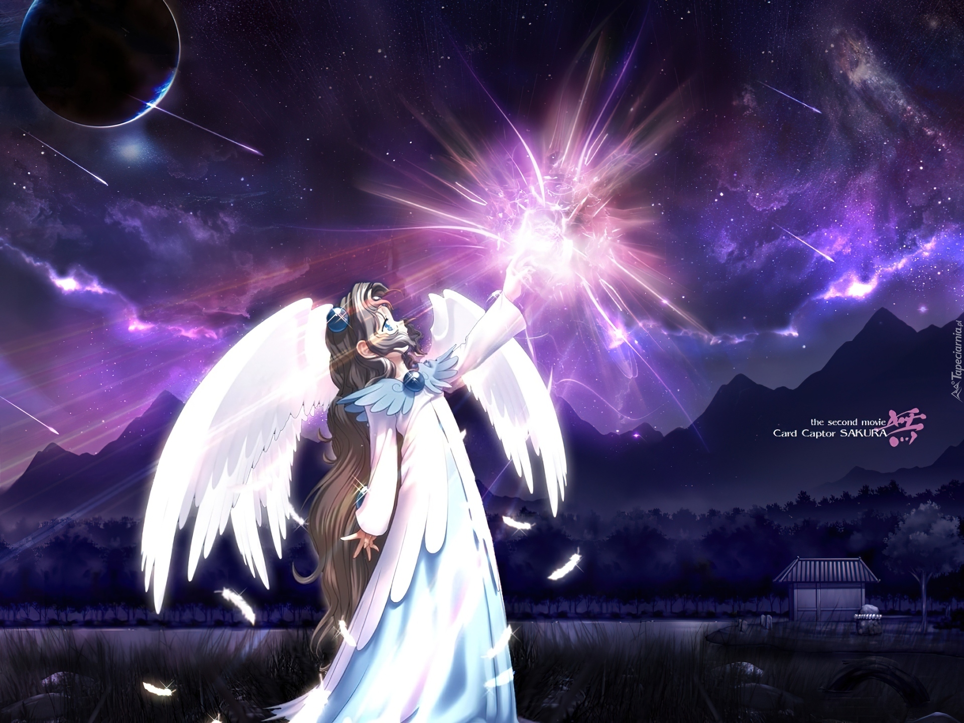 Edytor tapety: Cardcaptor Sakura, skrzydła, pióra, postać, gwiazdy, planeta