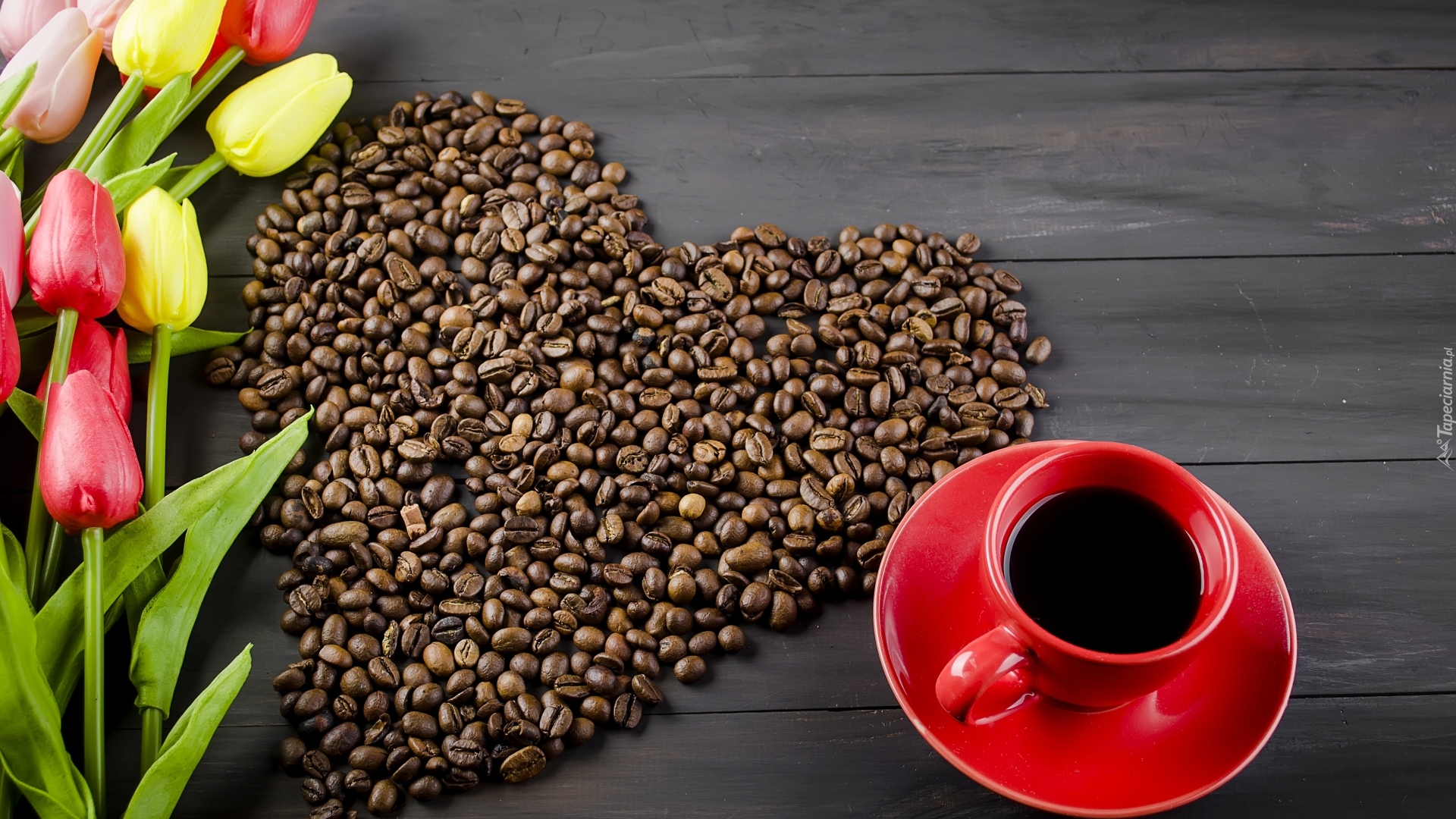 Edytor tapety: Tulipany ułożone wokół ziaren kawy i filiżanki
