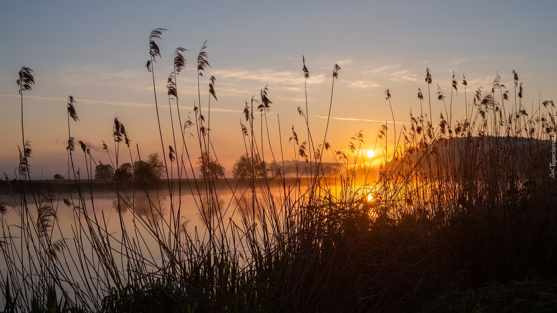 Edytor tapety: Szuwary nad jeziorem w promieniach zachodzącego słońca