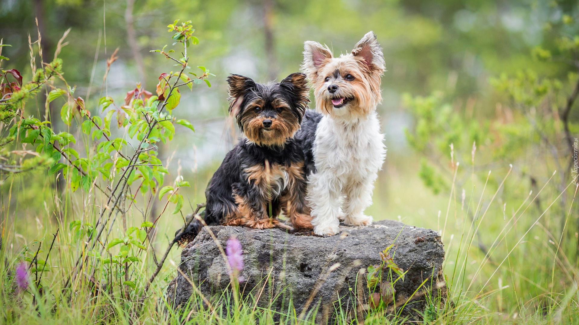 Edytor tapety: Dwa psy yorkshire terrier na kamieniu w trawie