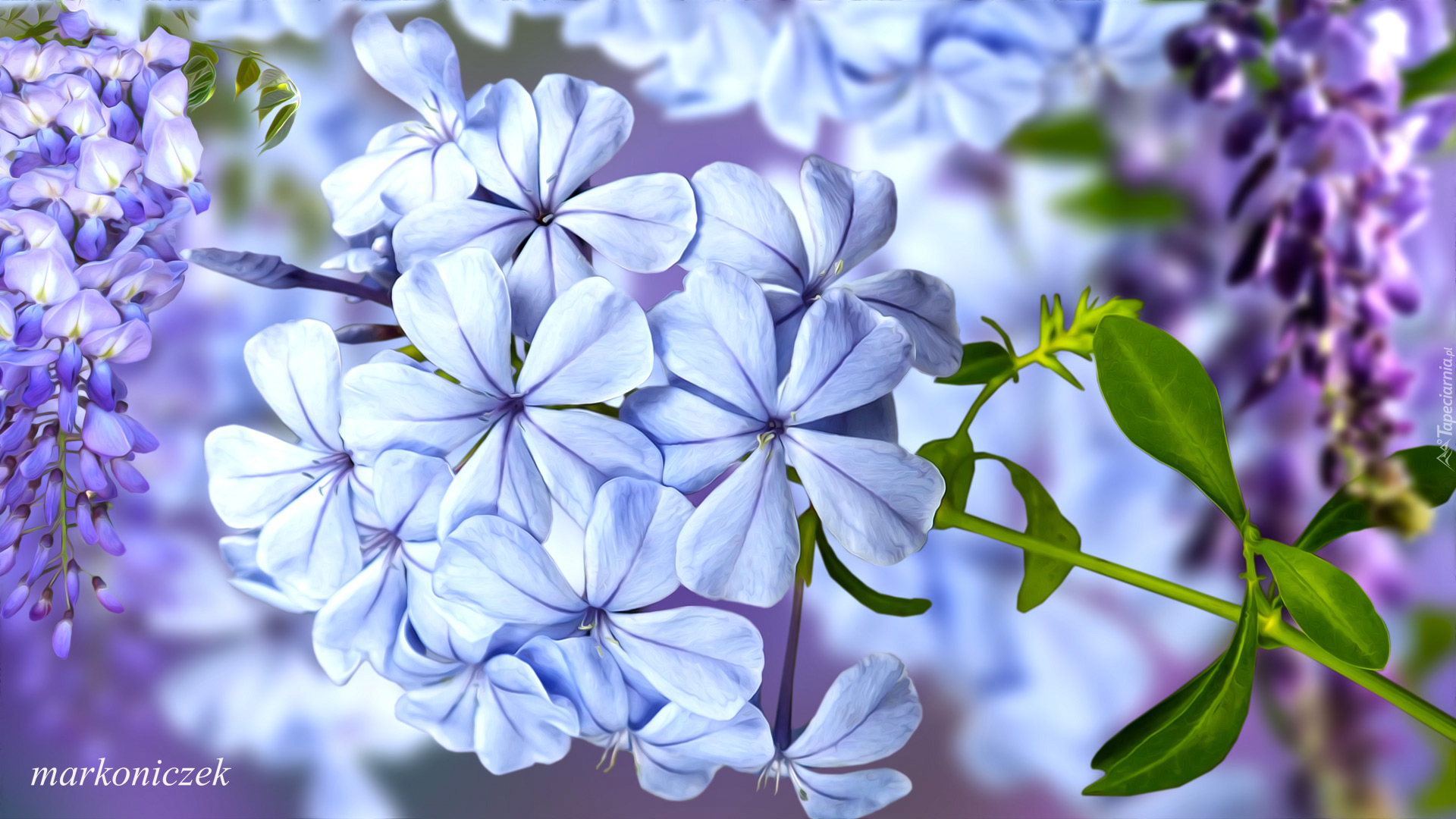 Edytor tapety: Niebieskie kwiaty i glicynia w grafice
