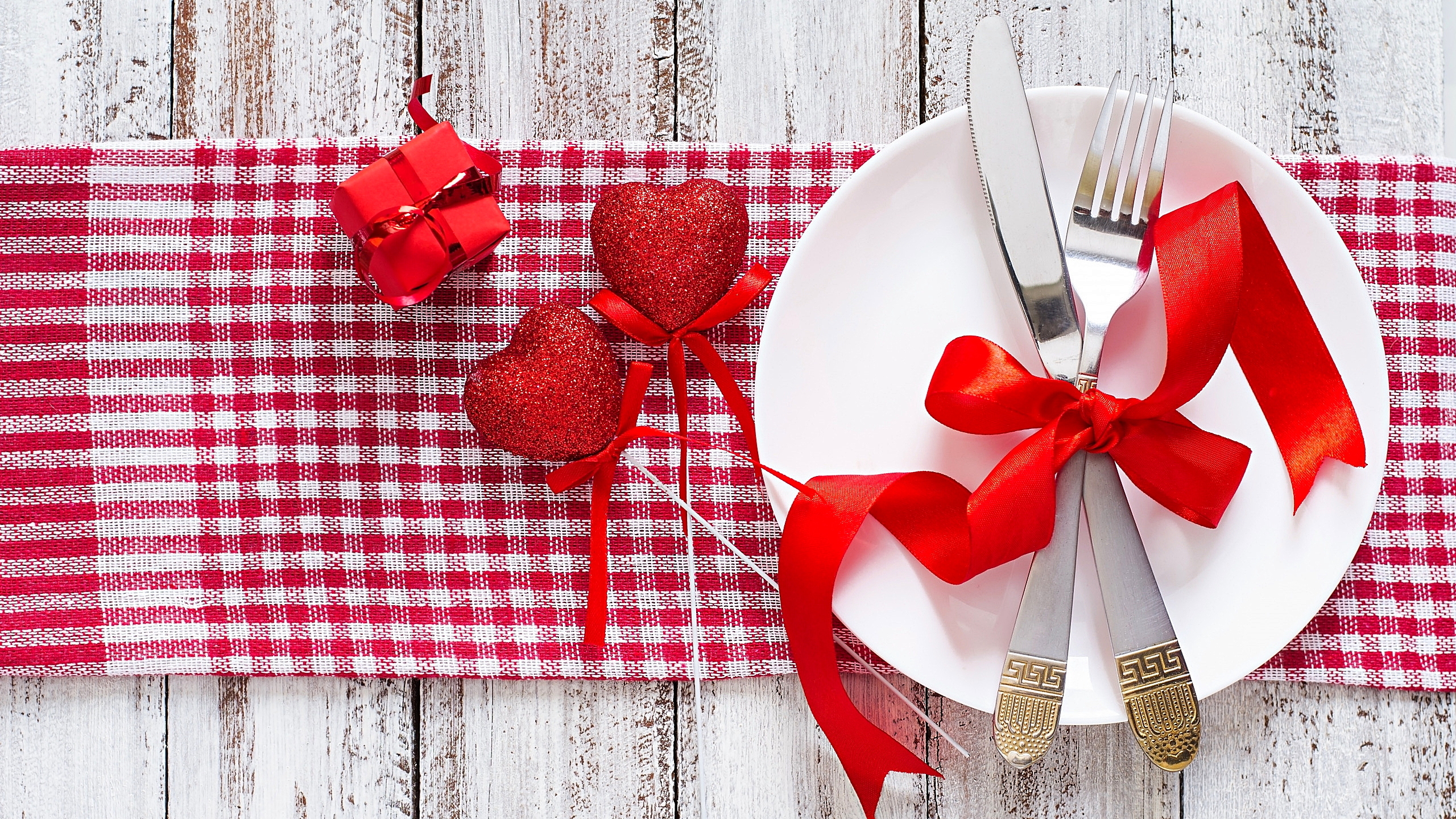 Edytor tapety: Prezent i serduszka obok sztućców przewiązanych wstążeczką