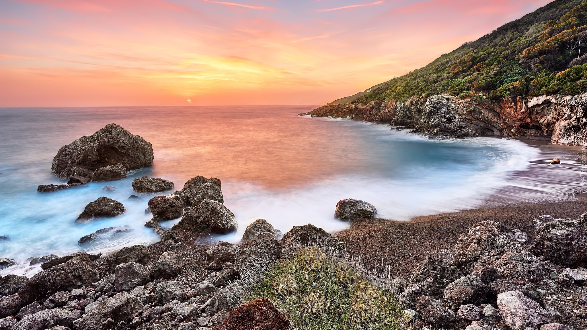 Edytor tapety: Wschód słońca nad skalistym wybrzeżem morza