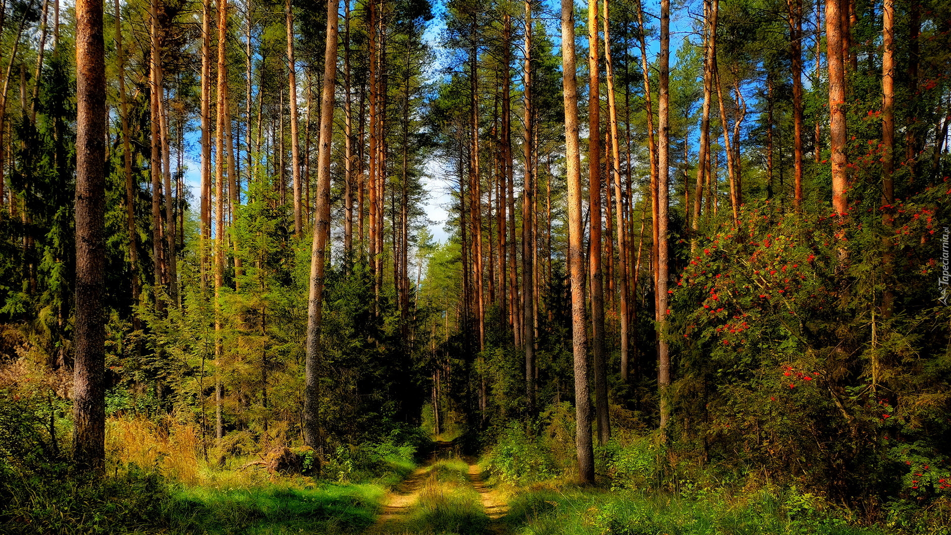 Edytor tapety: Wysokie drzewa przy drodze w lesie