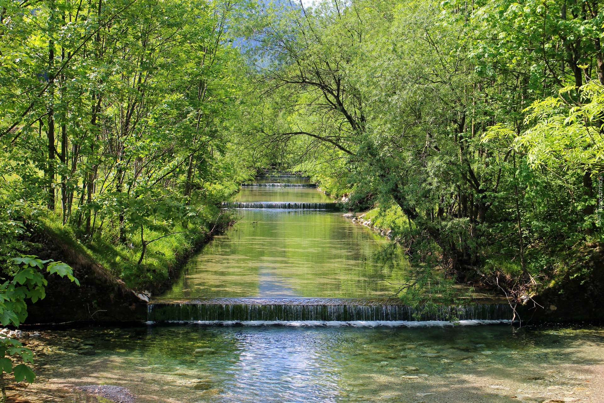 Edytor tapety: Progi wodne na leśnej rzece w słonecznym blasku