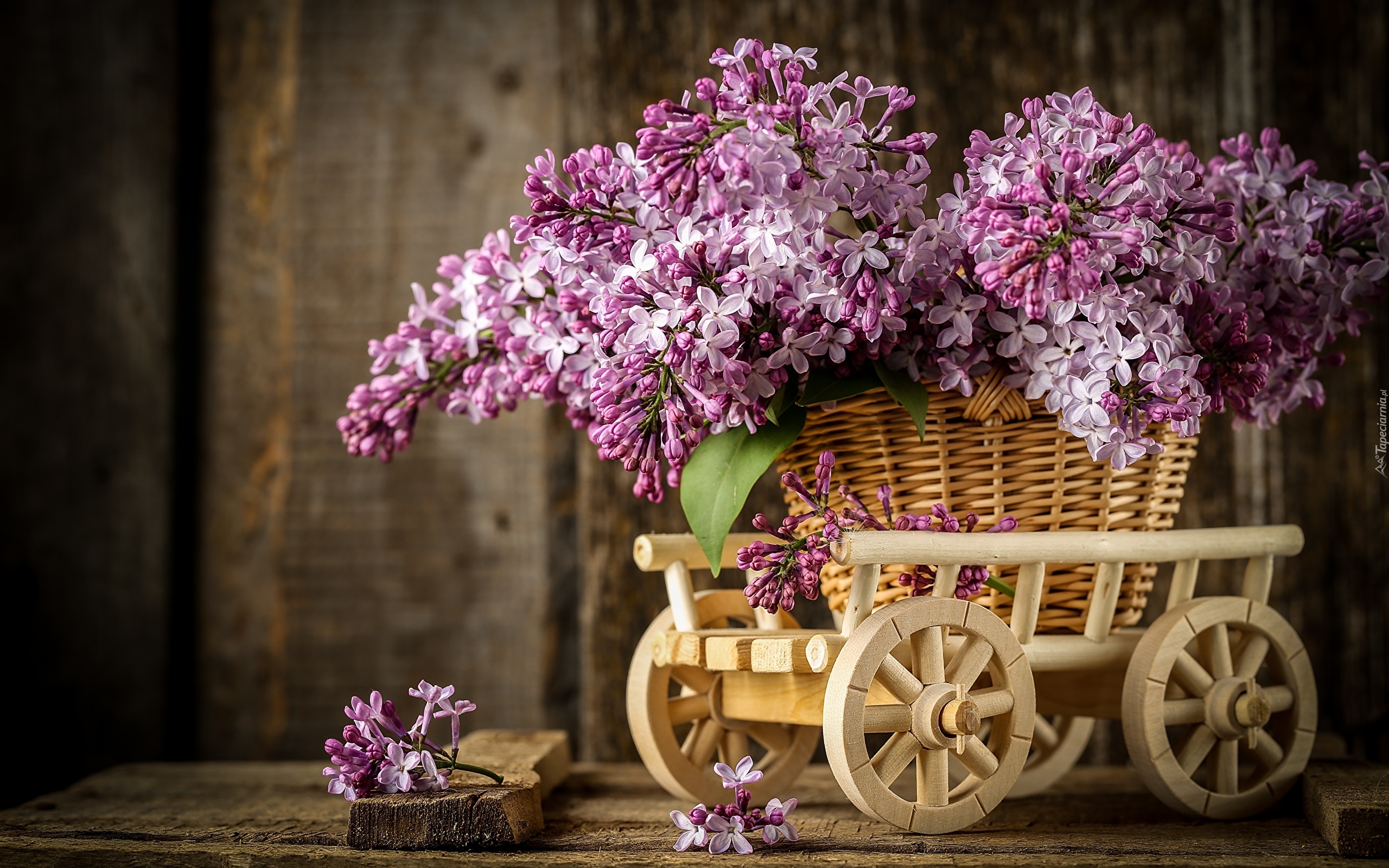Edytor tapety: Koszyk z bzem na drewnianym wózku