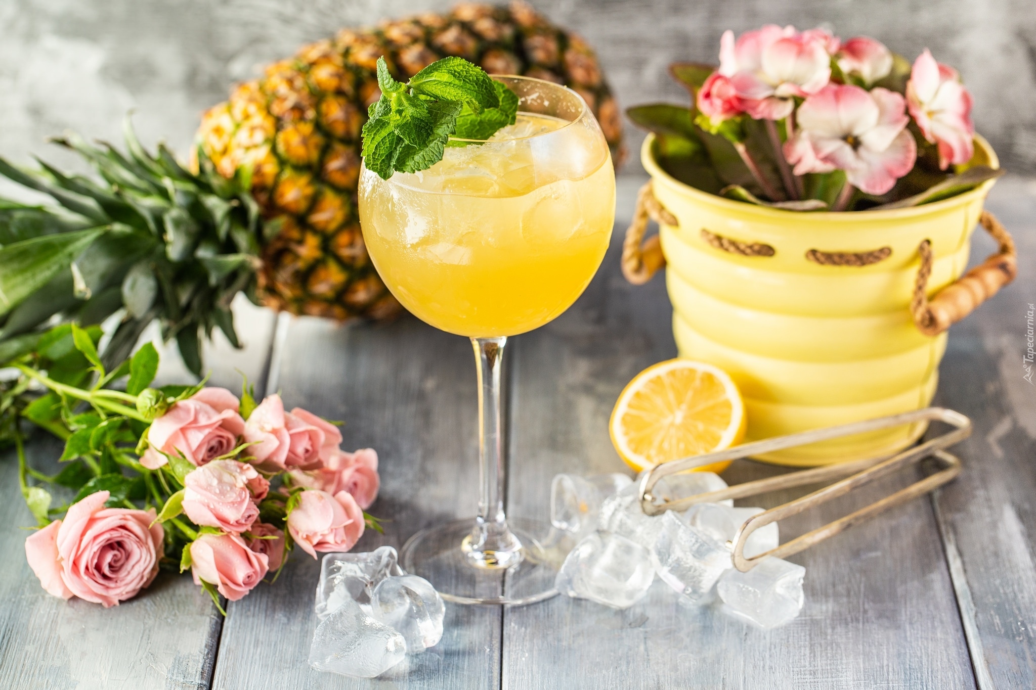 Edytor tapety: Sok ananasowy z kostkami lodu obok róż