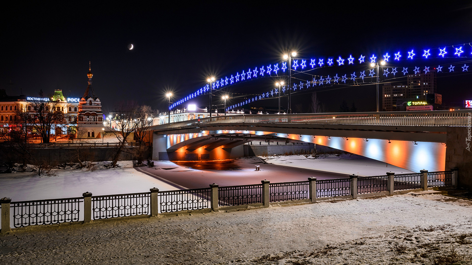 Edytor tapety: Oświetlony most nad rzeką Om w Omsku
