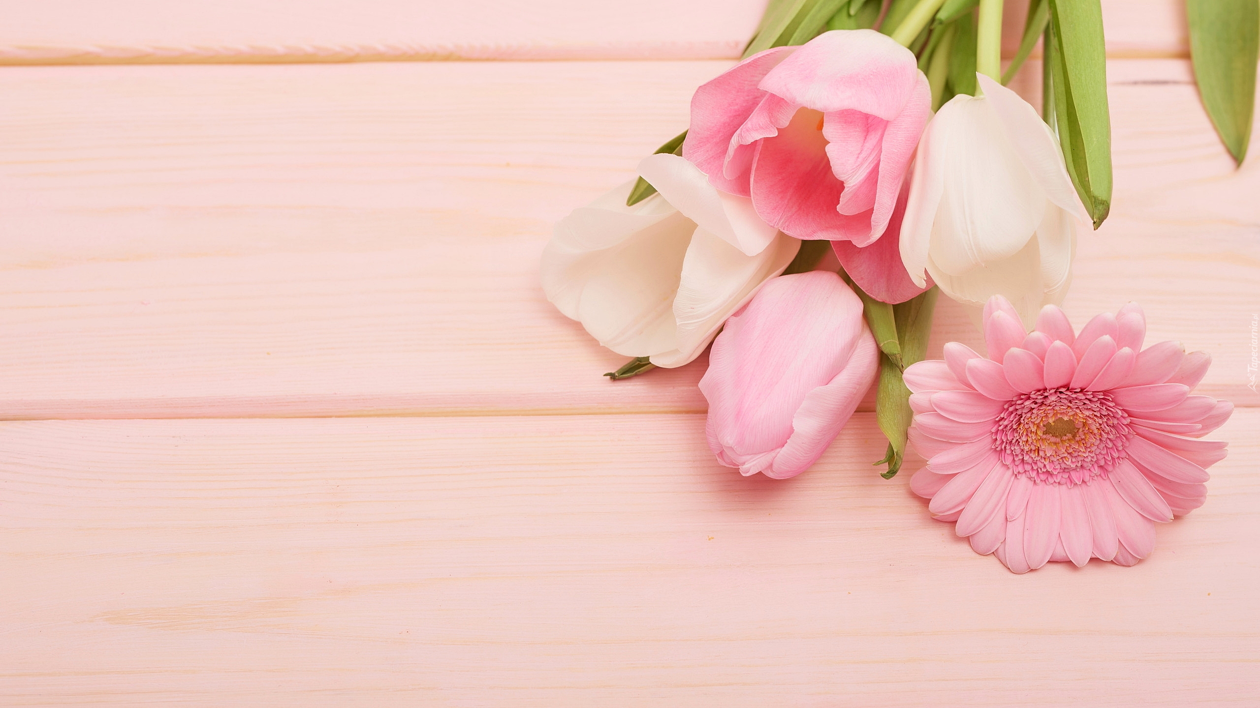 Edytor tapety: Tulipany i gerbera na różowym tle