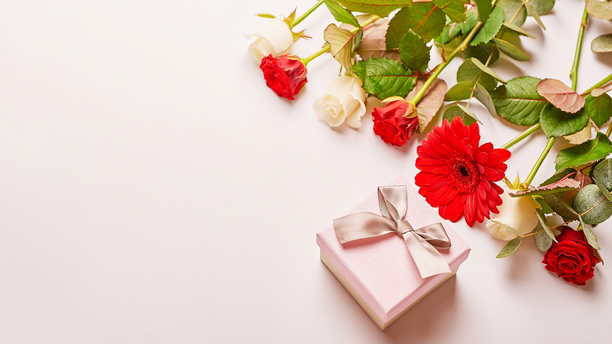 Edytor tapety: Prezent obok róż i gerbery