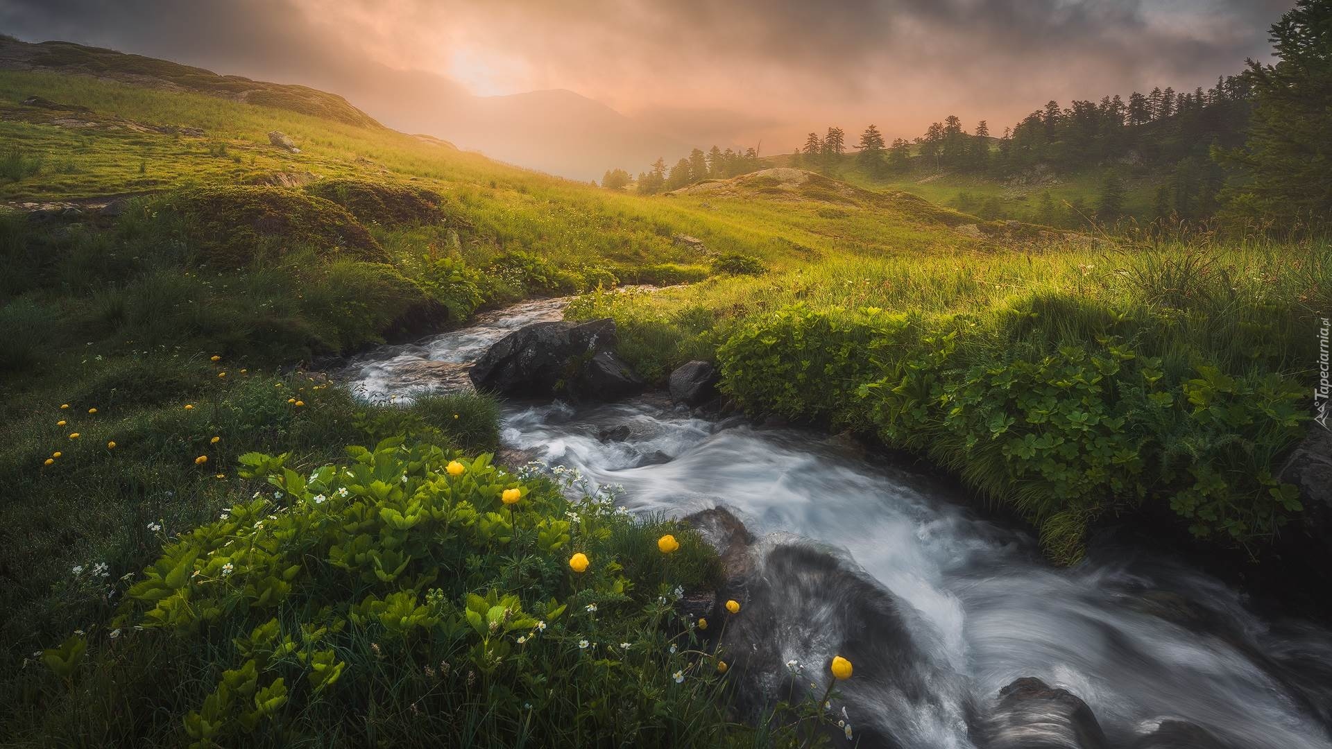 Edytor tapety: Rzeka przepływająca przez łąkę