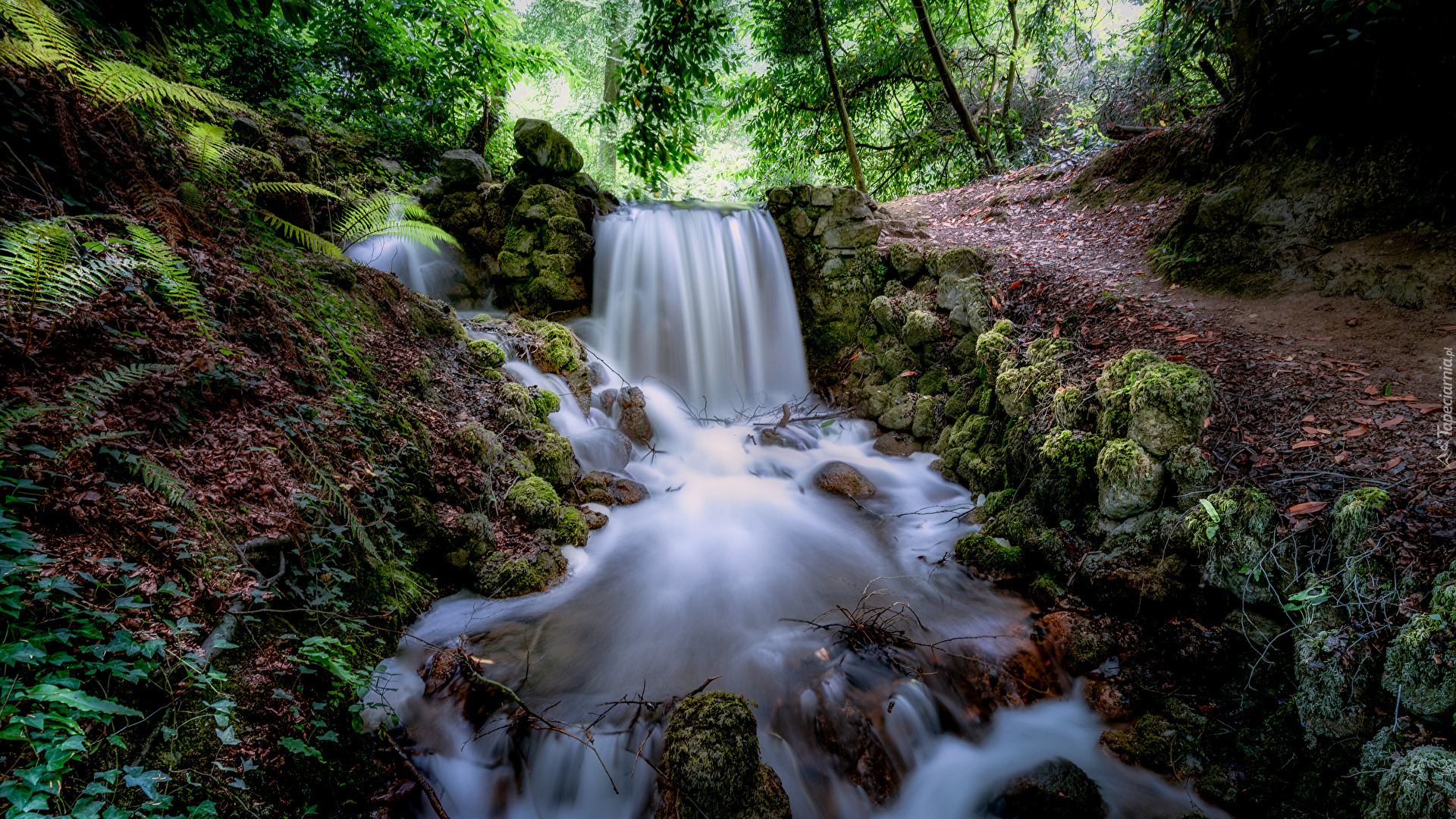 Edytor tapety: Leśny wodospad na omszałych skałach