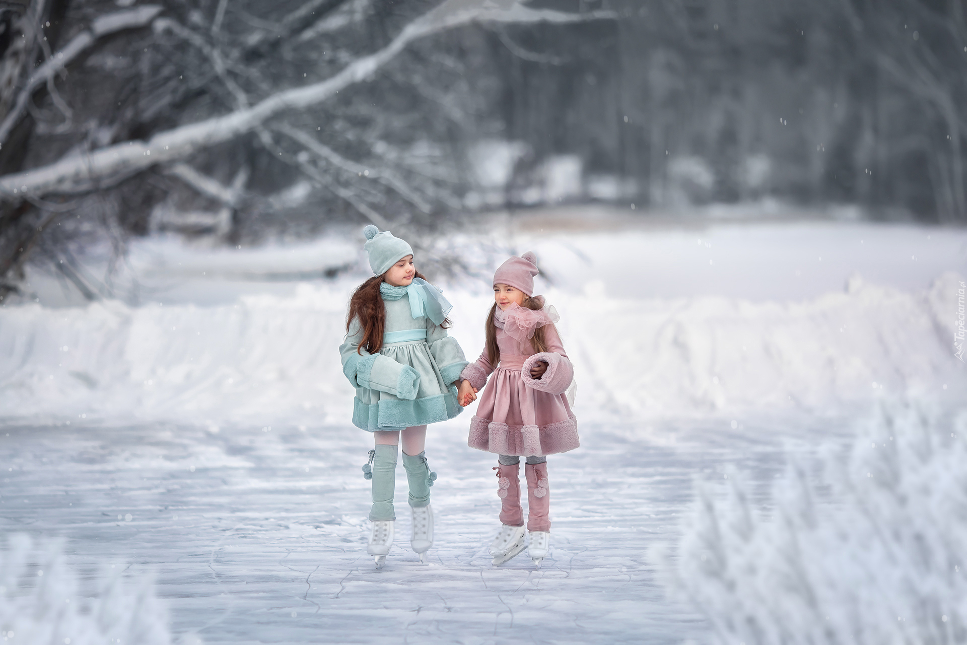Edytor tapety: Dwie dziewczynki na lodowisku wśród drzew