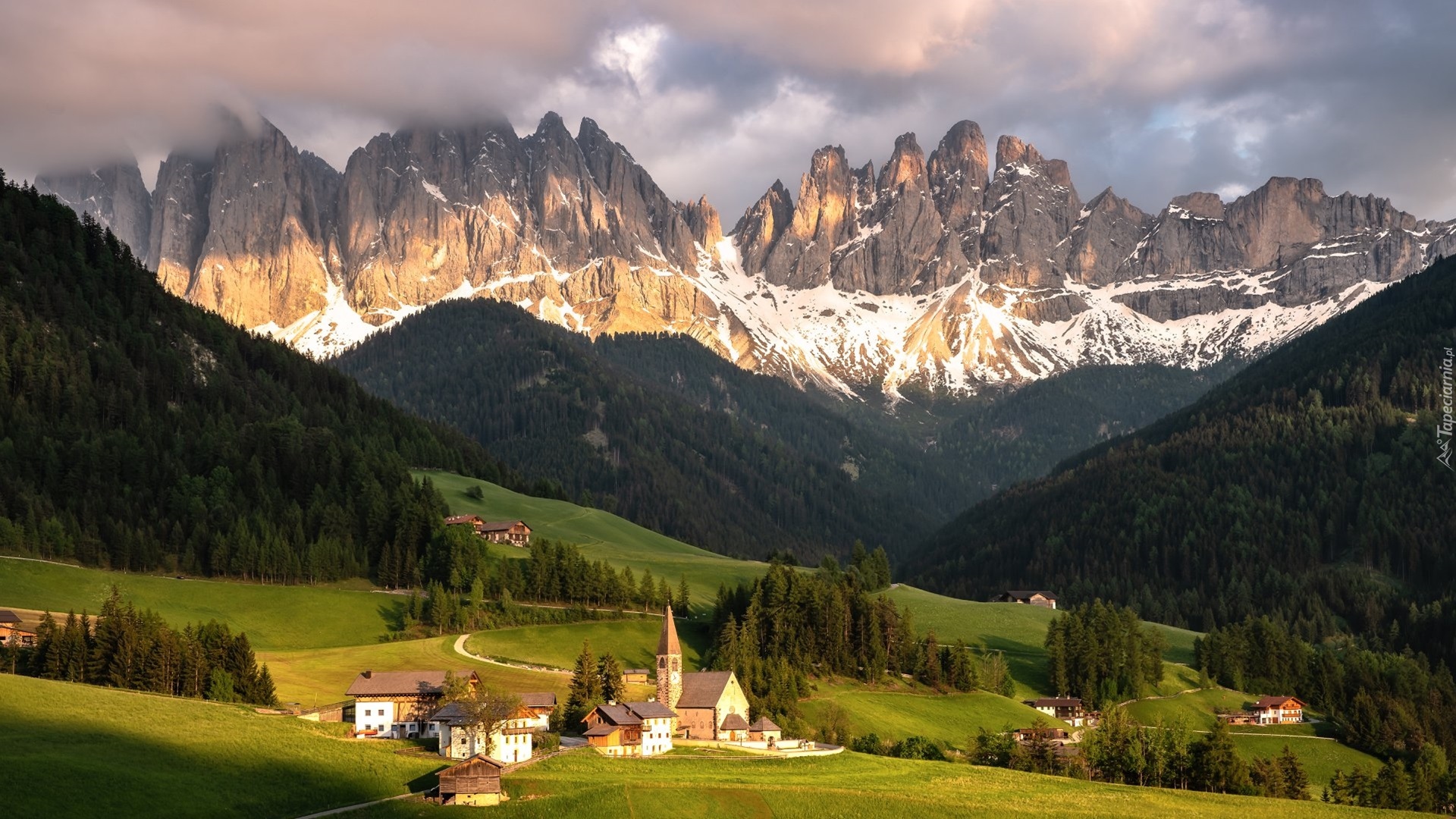 Edytor tapety: Wieś Santa Maddalena na tle włoskich Dolomitów