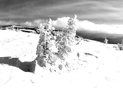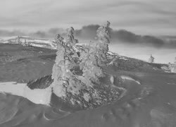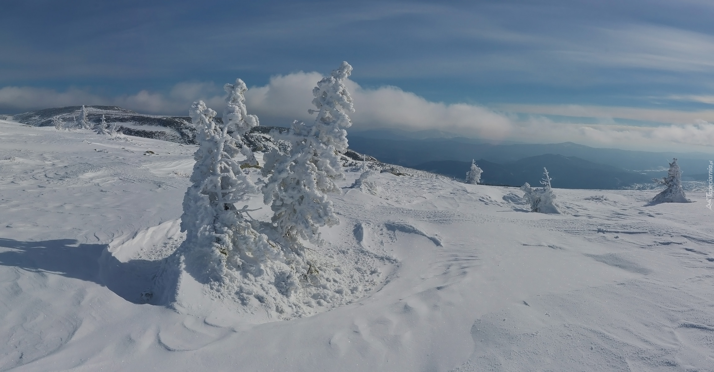 Edytor tapety: Zasypane śniegiem drzewa na tle gór