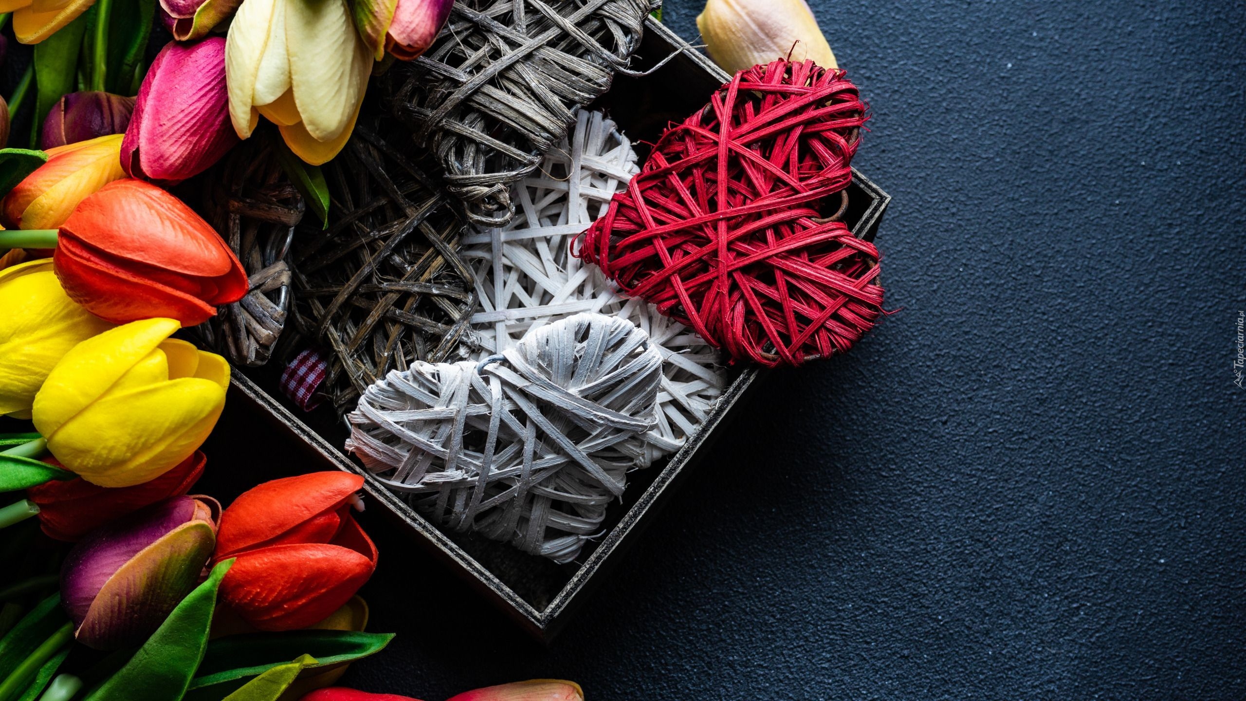 Edytor tapety: Serca w pudełku obok tulipanów