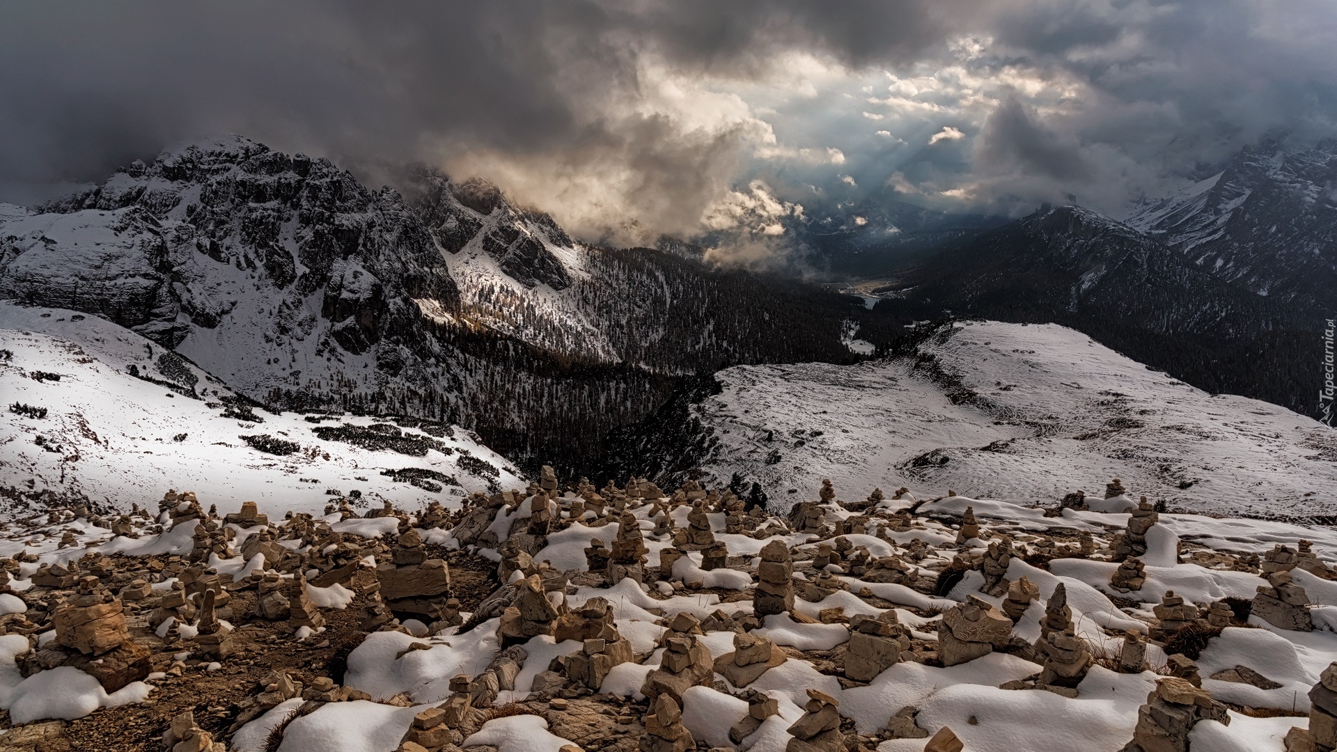Edytor tapety: Ciemne chmury nad ośnieżonymi górami