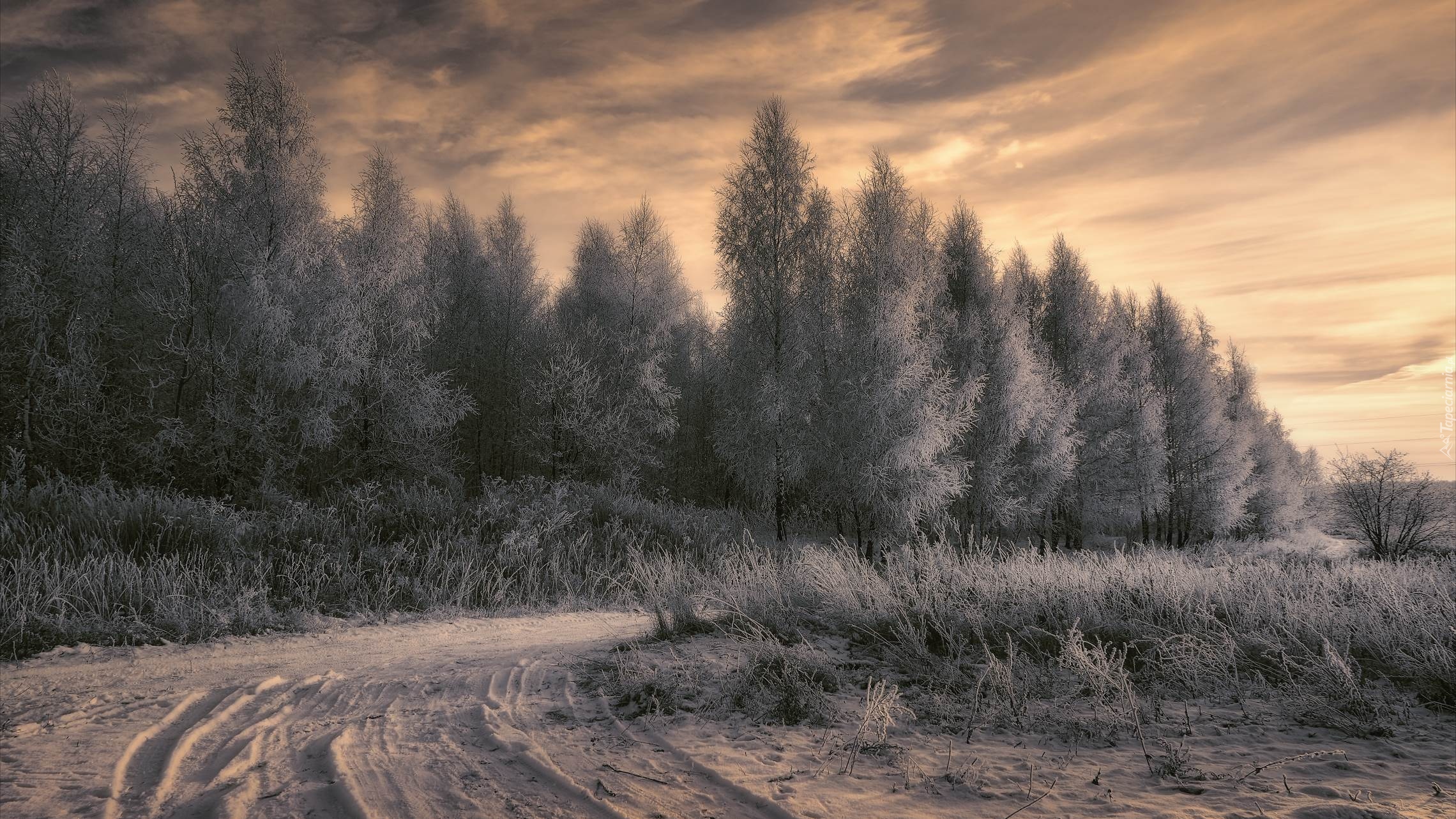Edytor tapety: Oszronione drzewa i trawa przy drodze