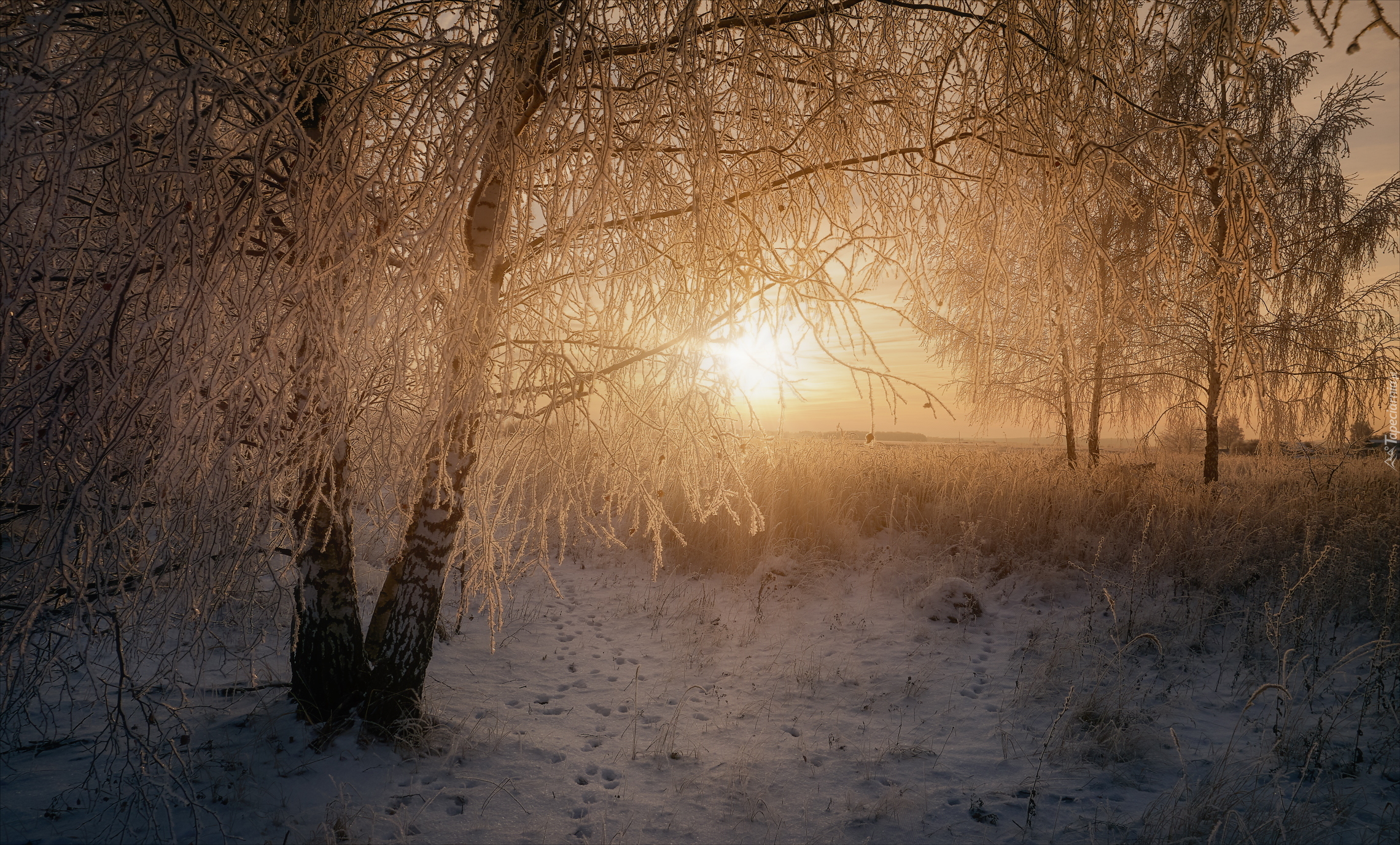 Edytor tapety: Oszronione drzewa w blasku wschodzącego słońca