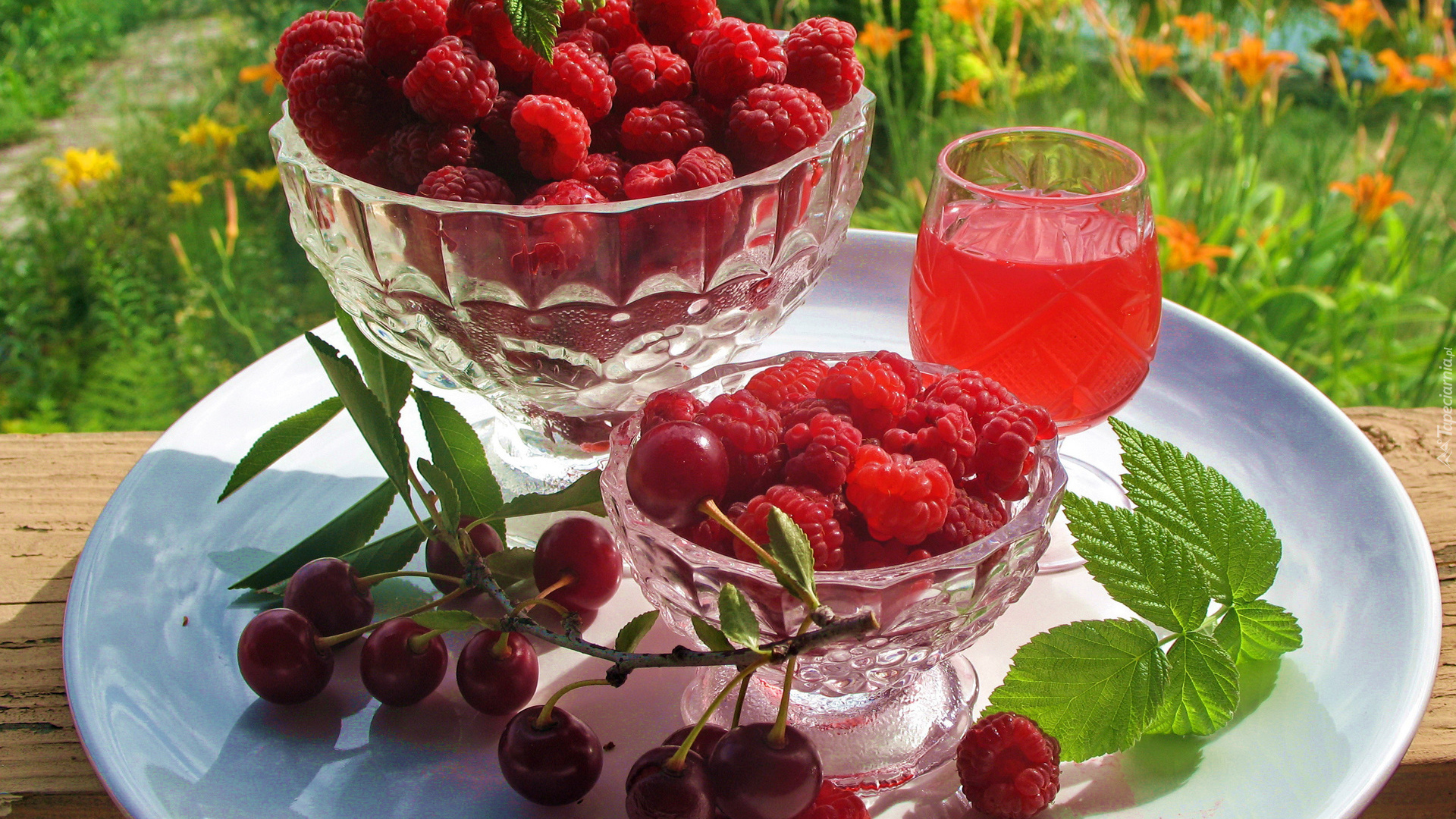 Edytor tapety: Maliny i wiśnie obok soku w kieliszku