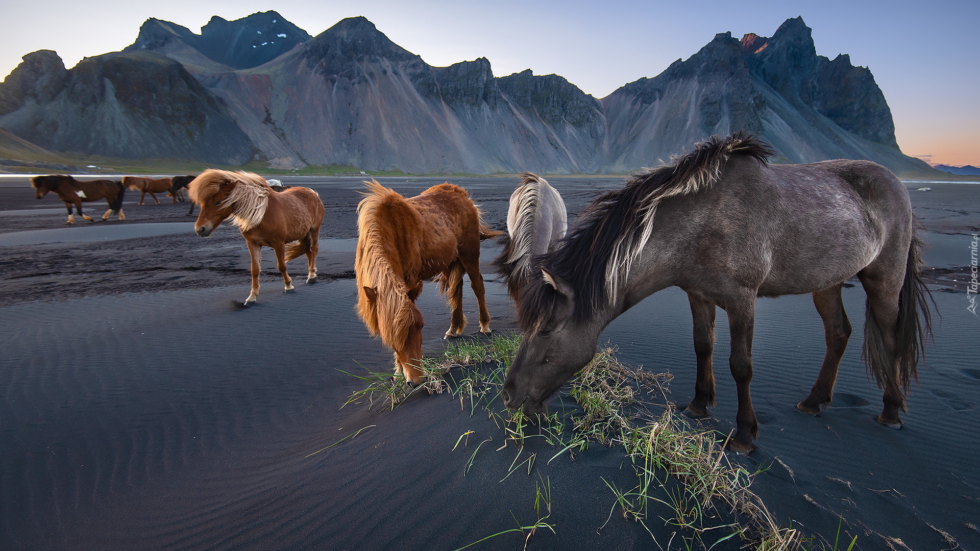 Edytor tapety: Konie na plaży Stokksnes w Islandii