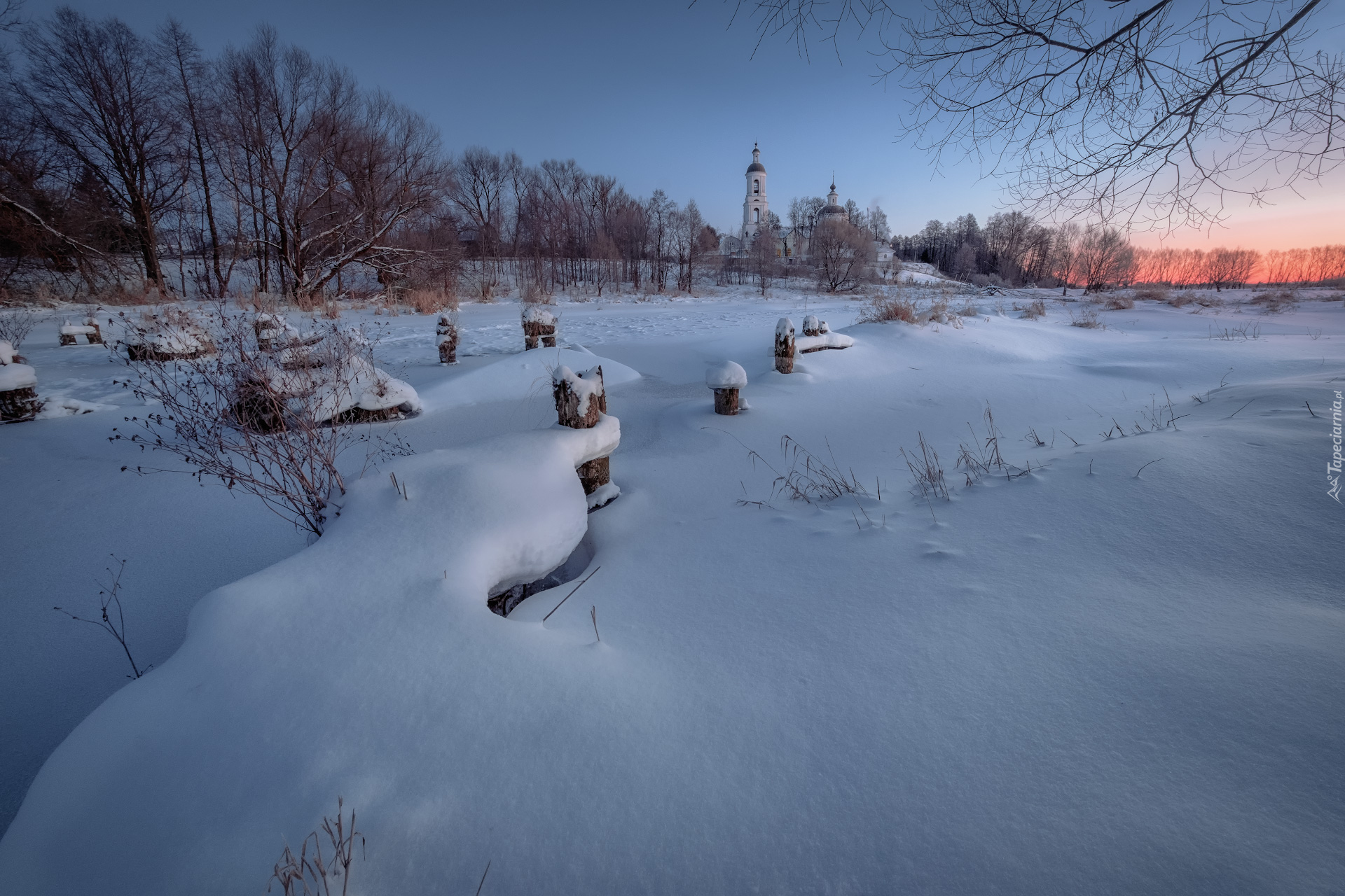 Edytor tapety: Cerkiew w pobliżu zasypanej śniegiem rzeki