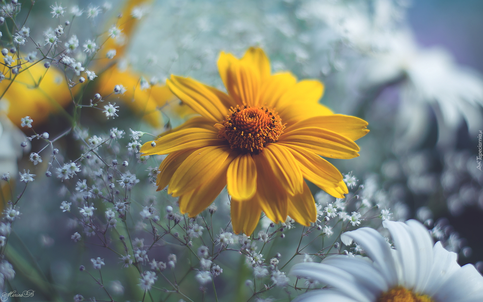 Edytor tapety: Żółta rudbekia z gipsówką w zbliżeniu