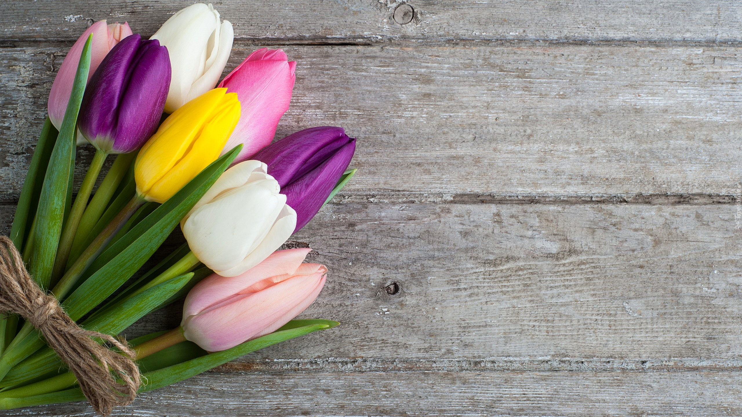 Edytor tapety: Kolorowe tulipany przewiązane sznurkiem