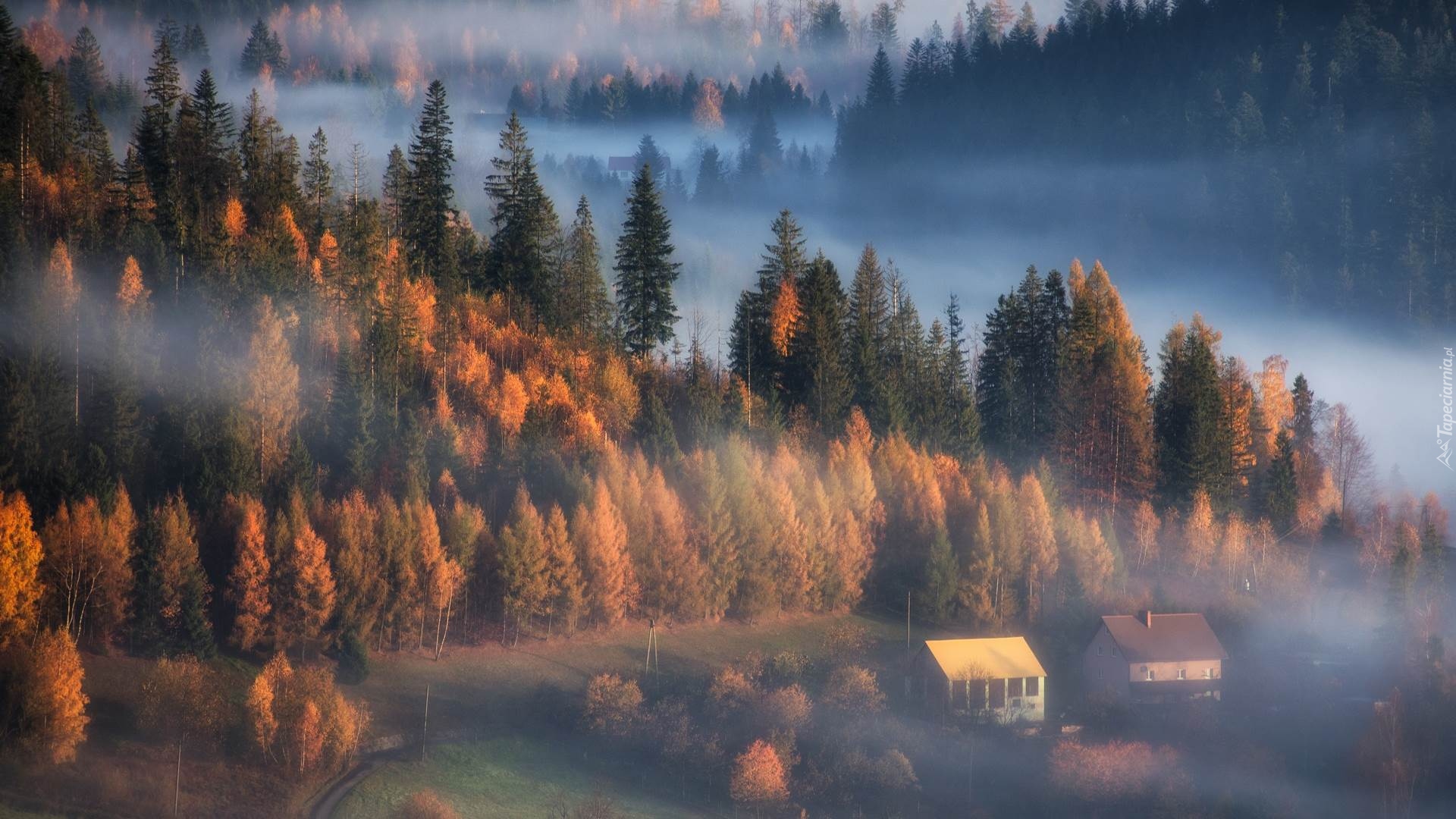 Edytor tapety: Mgła nad domami i jesiennym lasem