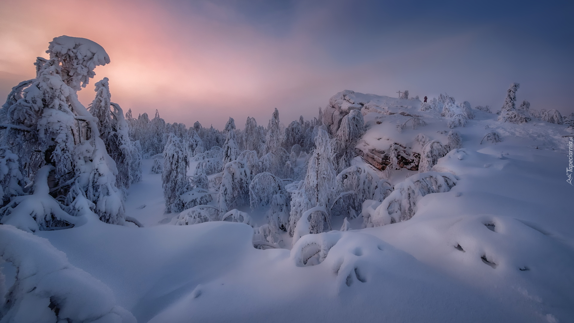 Edytor tapety: Zaśnieżone drzewa na szczycie góry Krestovaya w Rosji
